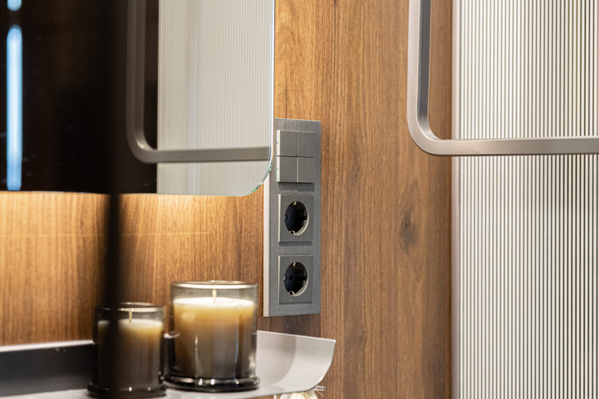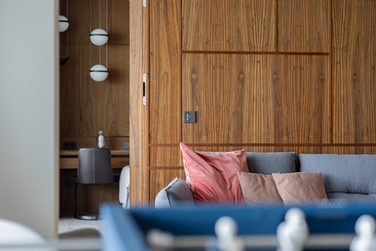 Ennek az a titka, hogy az okosvezérléshez használt eszközök elegáns, prémium megjelenésükkel tökéletesen illeszkednek a lakás stílusához. A vezérlőfelületek egyszerűek és egyértelműek: nem igényelnek technikai tudást, mégis minden funkciót kézben tarthatunk velük. Az apró, de lényeges részletek, mint például a tapintható visszajelzés vagy a személyre szabható felületek mind azt a célt szolgálják, hogy a lakás használata intuitív és élvezetes legyen. Akár egyetlen kijelzőről megoldható a világítás, a redőnyök és a hőmérsékletszabályzás vezérlése. A nyomógombok igény szerint feliratozhatók, sőt bármilyen egyedi minta is elhelyezhető rajtuk, így a kialakítás teljes mértékben személyre szabható. Ez rendkívül sokoldalúvá teszi a sorozatot, miközben a megjelenés esztétikus és letisztult marad.