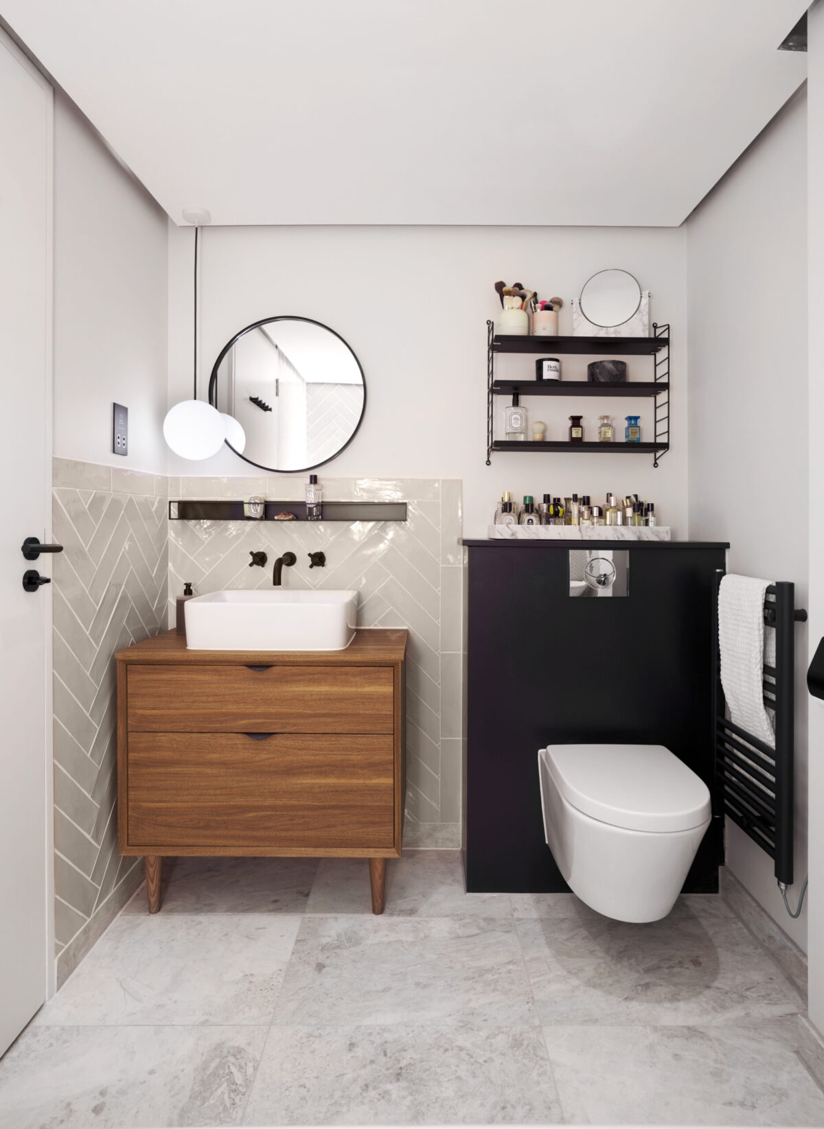 Fürdőszoba: egyszerű csempék, fa kiegészítők, fekete csaptelepek – természetes és modern egyszerre.