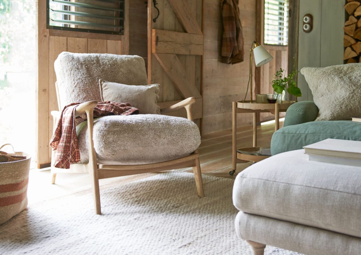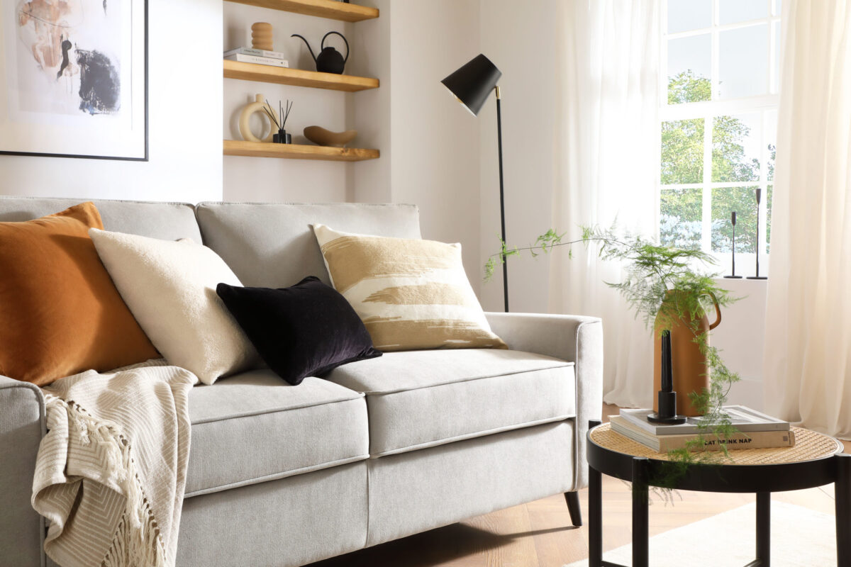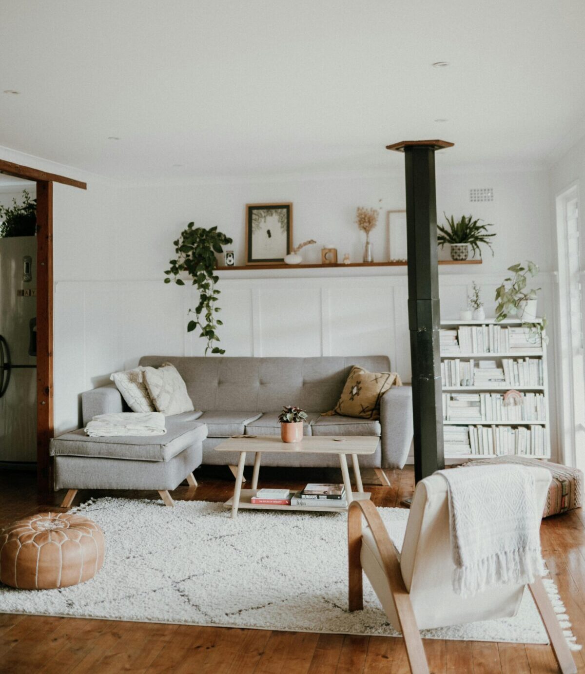 Nappali: világos kanapé, natúr fa dohányzóasztal, kötött takaró, sok természetes fény, néhány zöld növény – kész is a hygge-sarok.