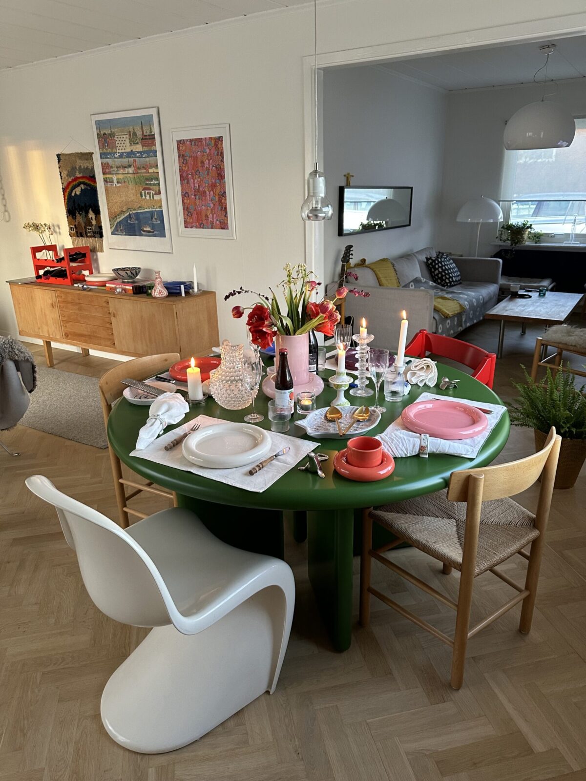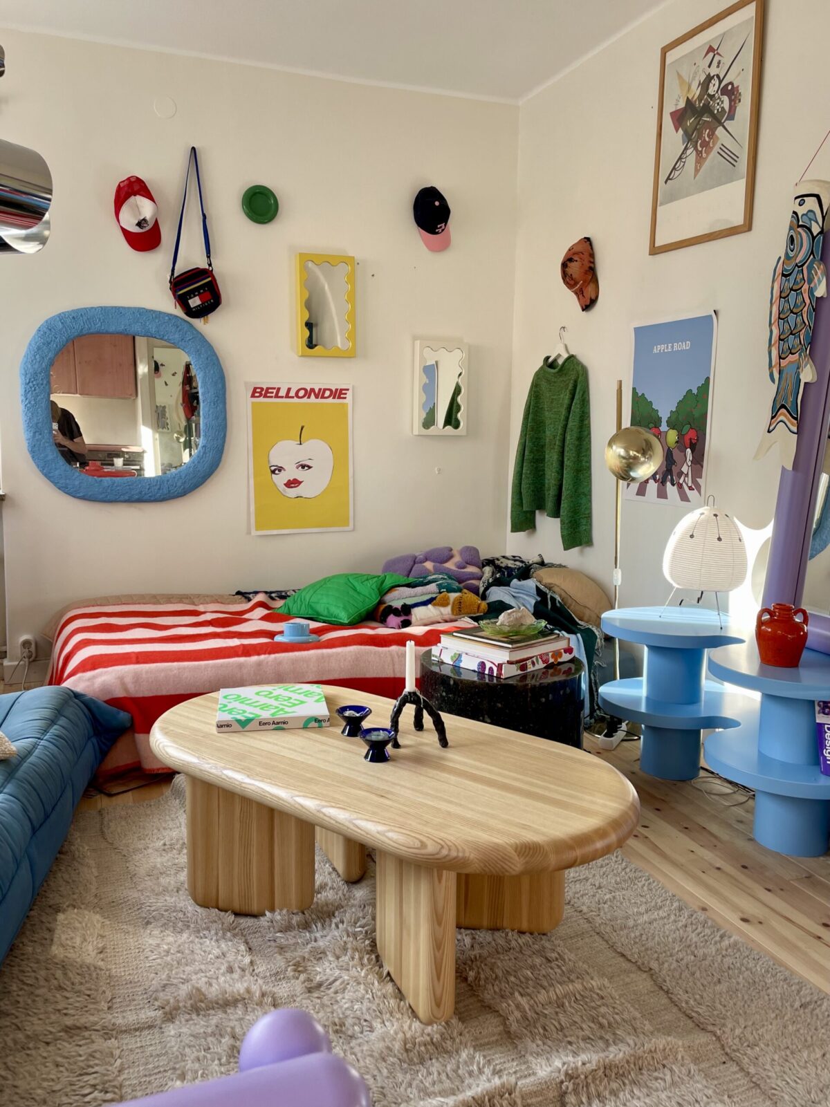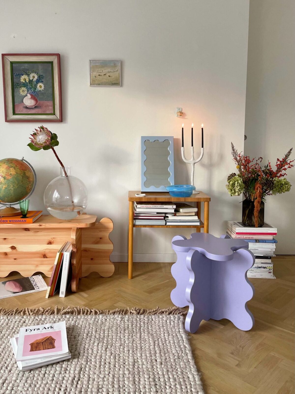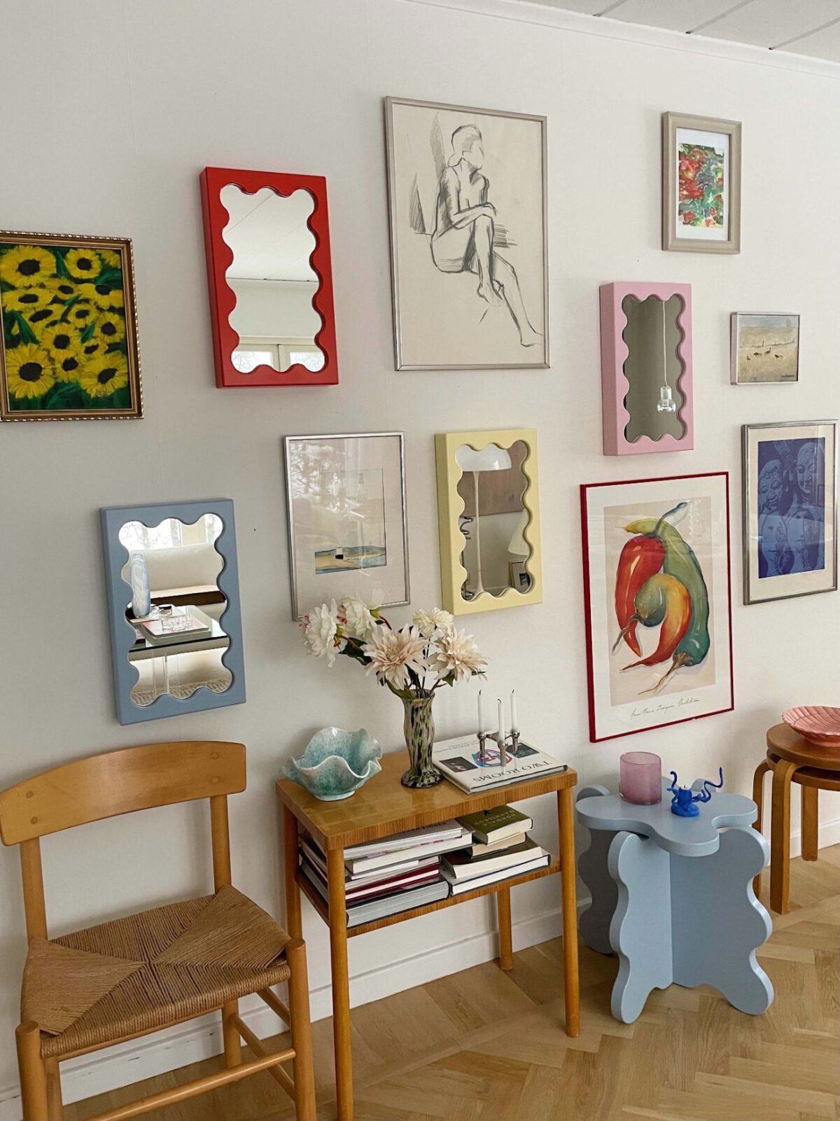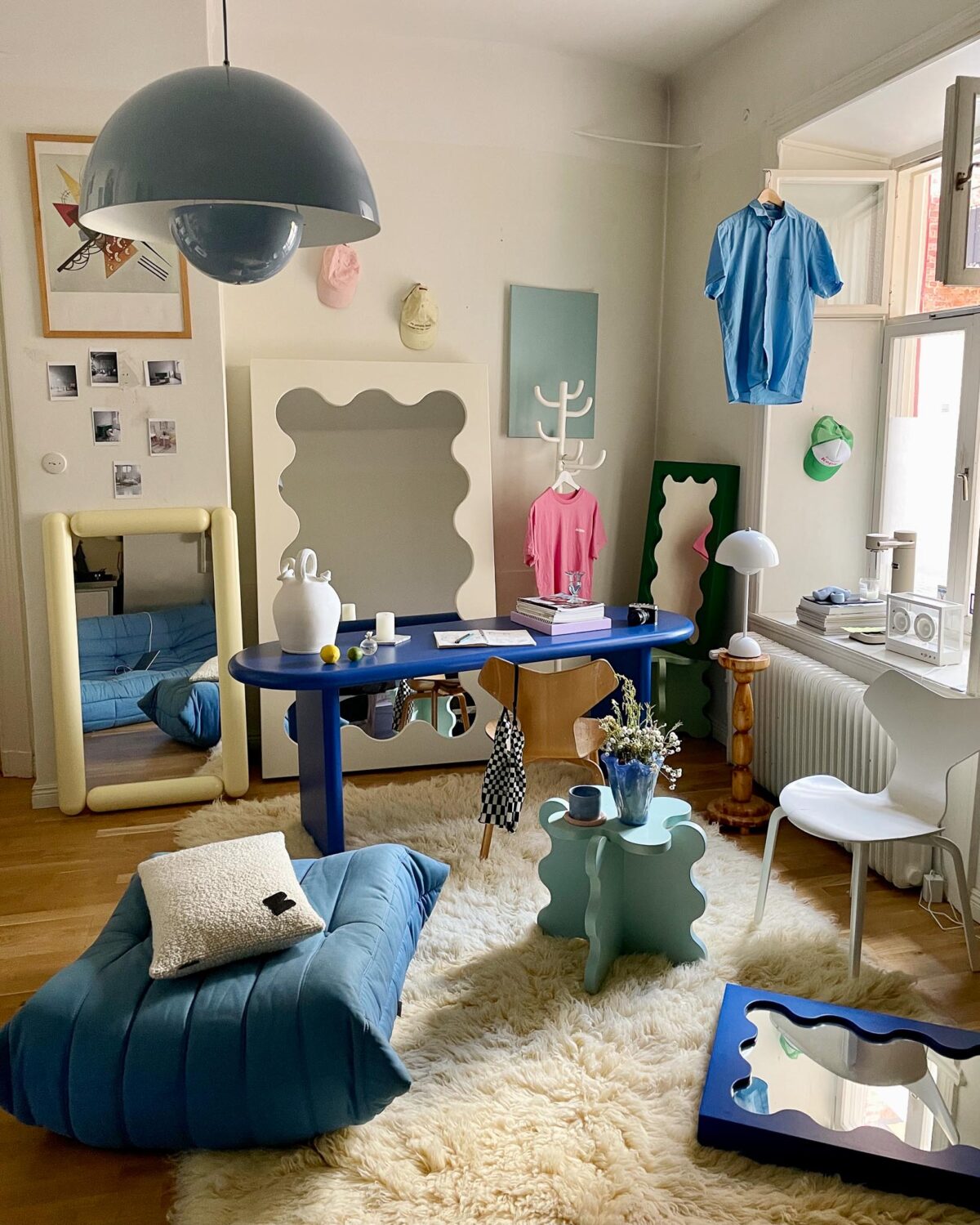 Semleges háttérrel működik a legjobban, világos falak és egyszerű bútorok között egy színes, hullámos asztal vagy tükör kiemelkedik, anélkül hogy giccses hatást keltene.