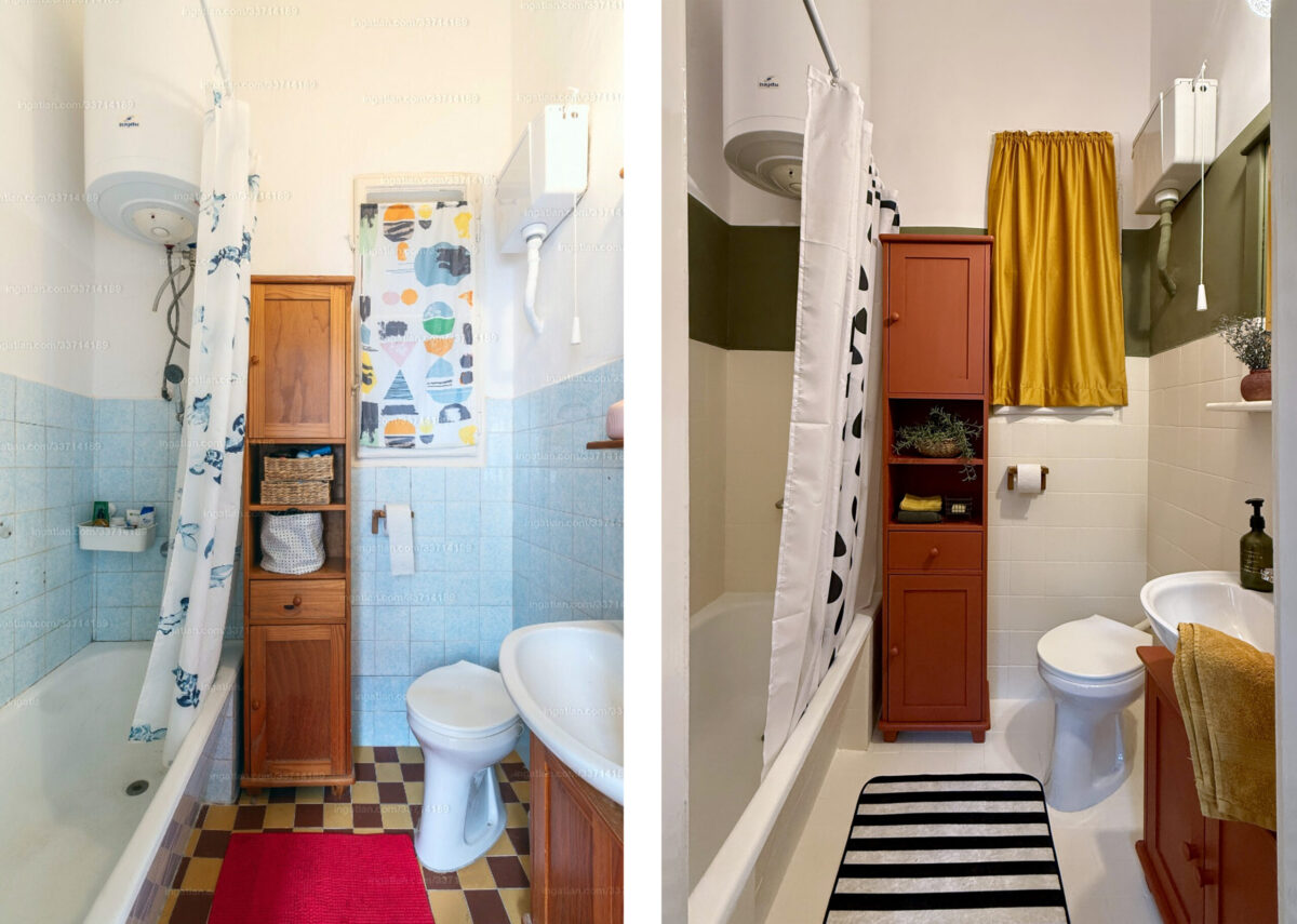 A fürdőszobában a színeket illetően határozott elképzelései voltak a megrendelőnek, de karakteres elgondolásai szerencsére összecsengtek a stílusommal. Semmit nem bonthattunk, mindent meg kellett tartanunk. Az ablak és az ajtó színe adott volt, ehhez igazítottuk a csempe színét, amit krétafestékkel festettünk le.