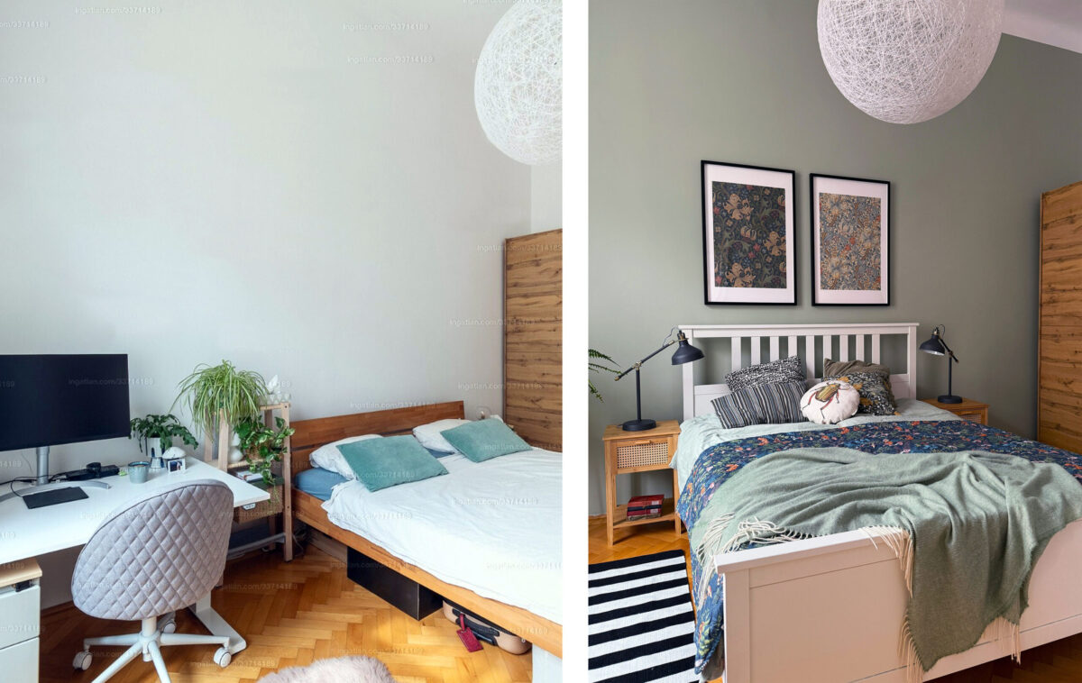 A tervezési munkát a hálószobával kezdtem, egyszerűen azért, mert ennek a helyiségnek a koncepciója állt össze a fejemben leghamarabb. Azt szerettem volna, hogy ez a szoba a nyugalom szigete legyen, ezért túlnyomórészt a természet színében gondolkodtam. A zöldet a harmónia színének is nevezik, mert nyugtató, pihentető hatása van, ez a semleges szürkés-zöld árnyalat letisztult hátteret ad a helyiségnek. A berendezési tárgyak közül a gardróbszekrényt és a mennyezeti lámpát megtartottuk. Az IKEA Hemnes ágyat egy adok-veszek csoportban találtuk, fekete színe azonban nem illeszkedett a koncepcióba, ezért Enikő átfestette fehérre.