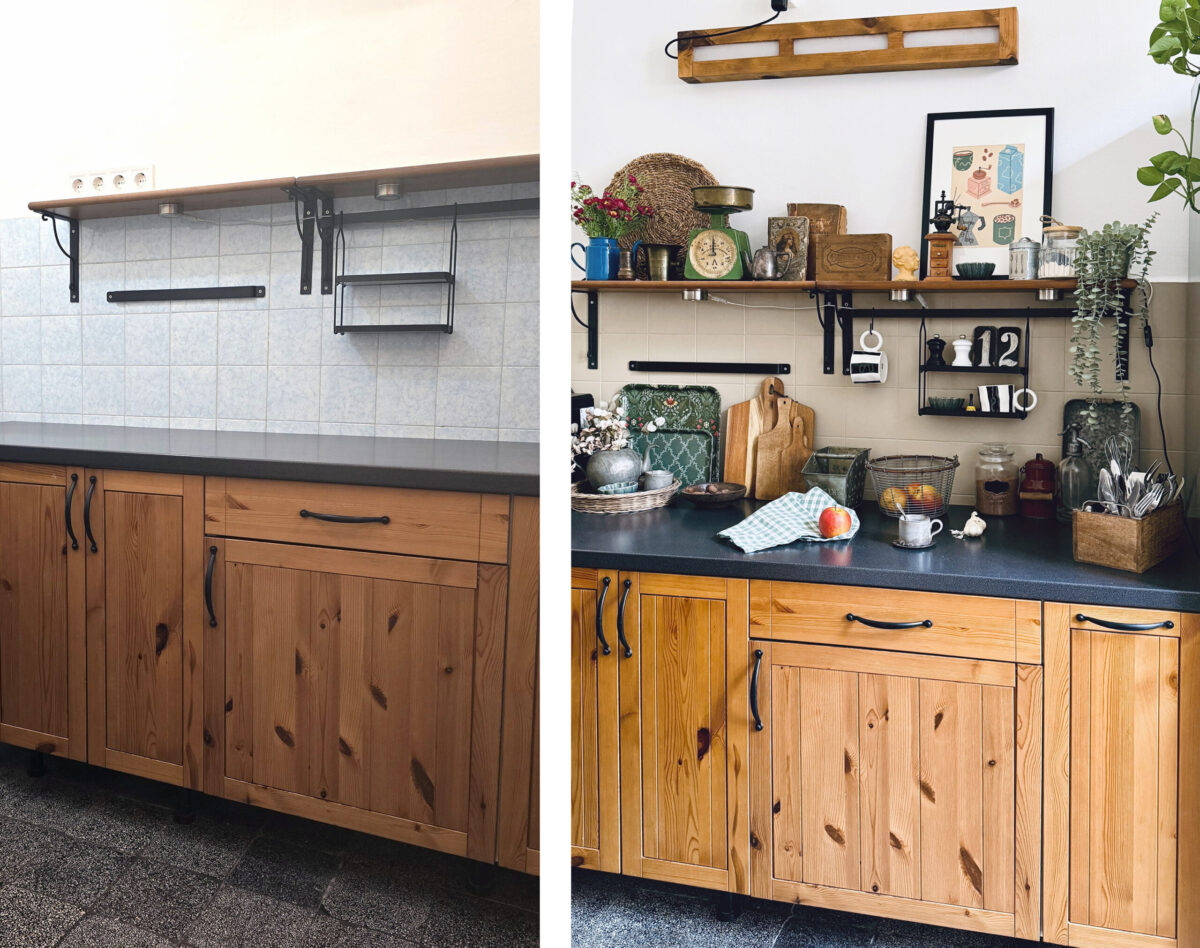 A konyhában sem volt mód a burkolat cseréjére. A csempét szürke krétafestékkel festett le Enikő, amit – ugyanúgy mint a fürdőben – Polyvine dekorációs gyorslakkal zárt le. Ennek a helyiségnek a berendezése majd a bérlőre vár, a fotózás indokolta ezt a kiegészítőkben, dekorokban gazdag kompozíciót.