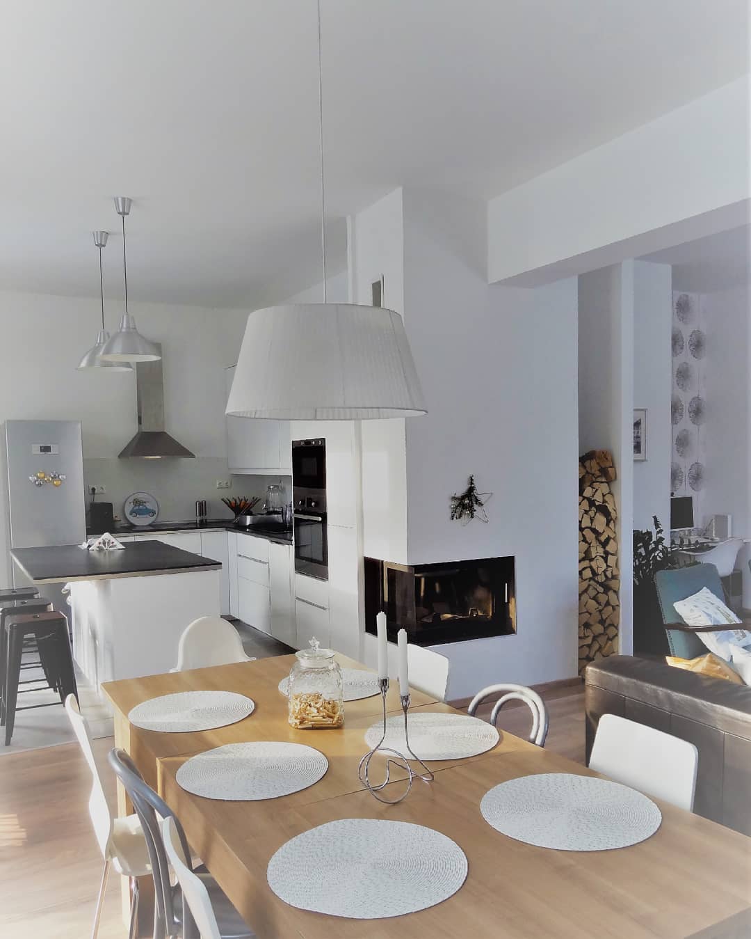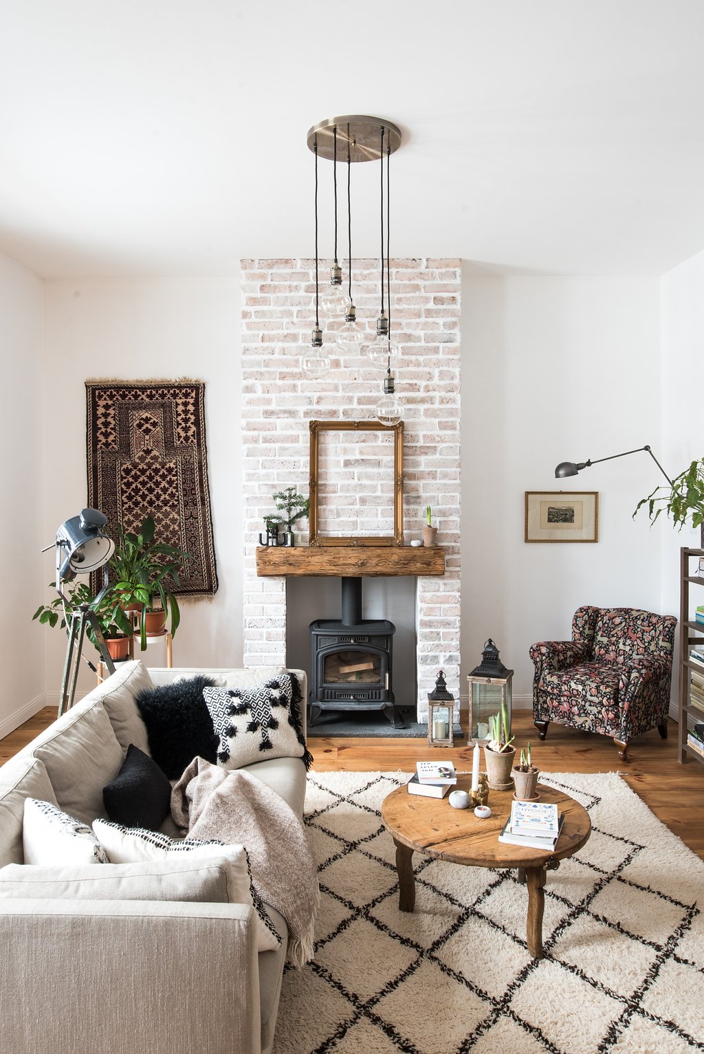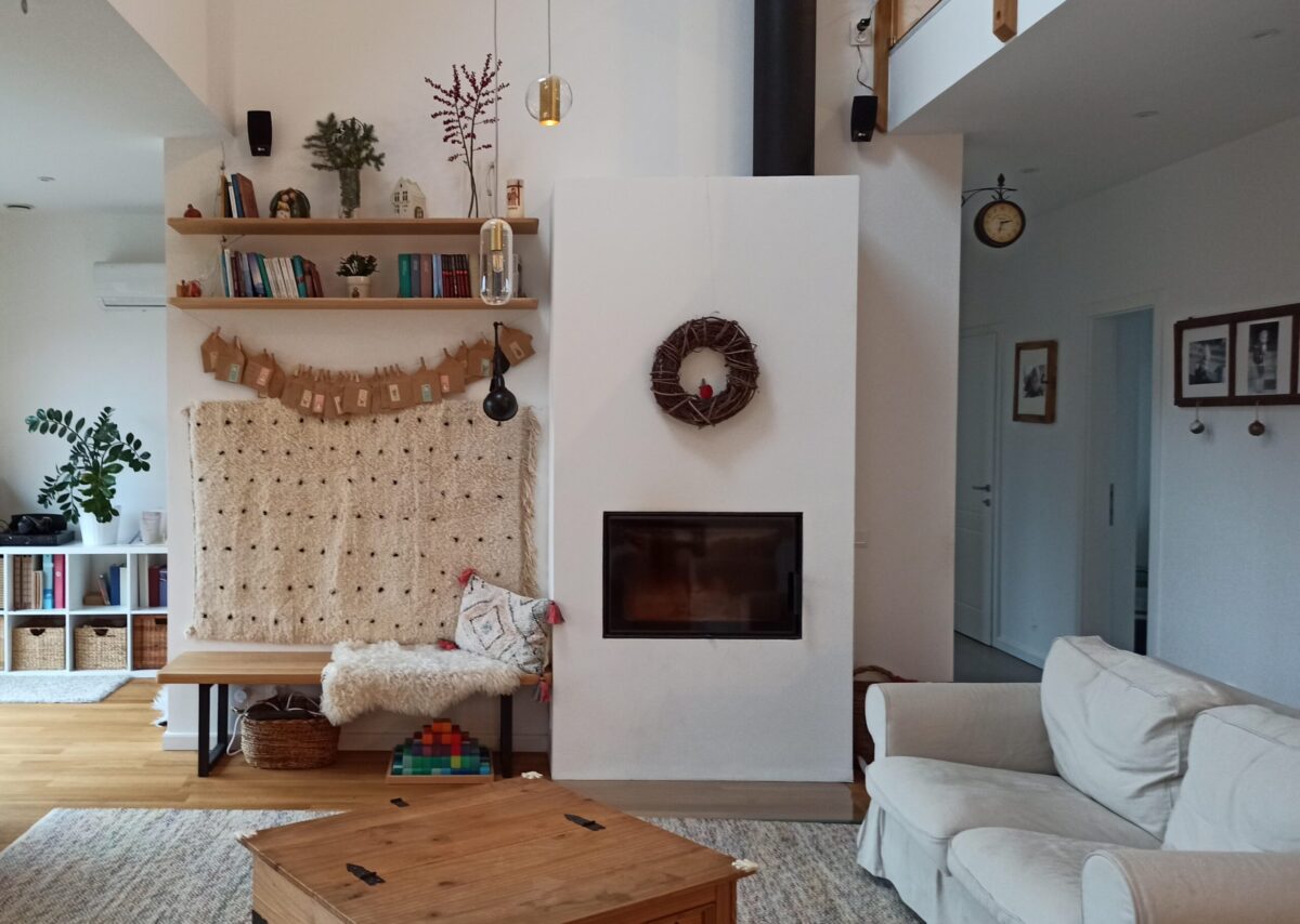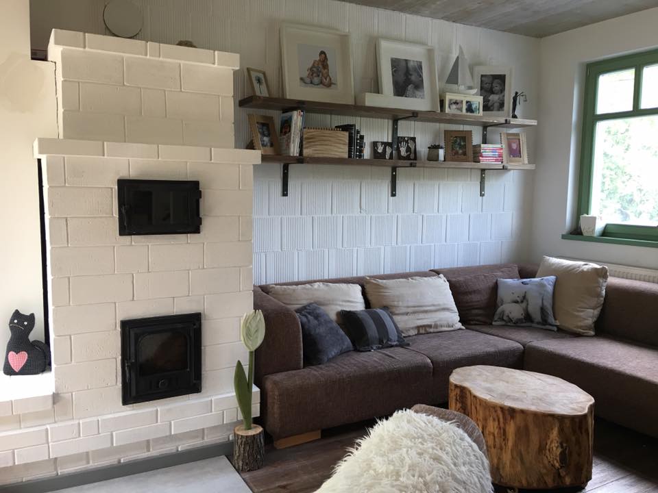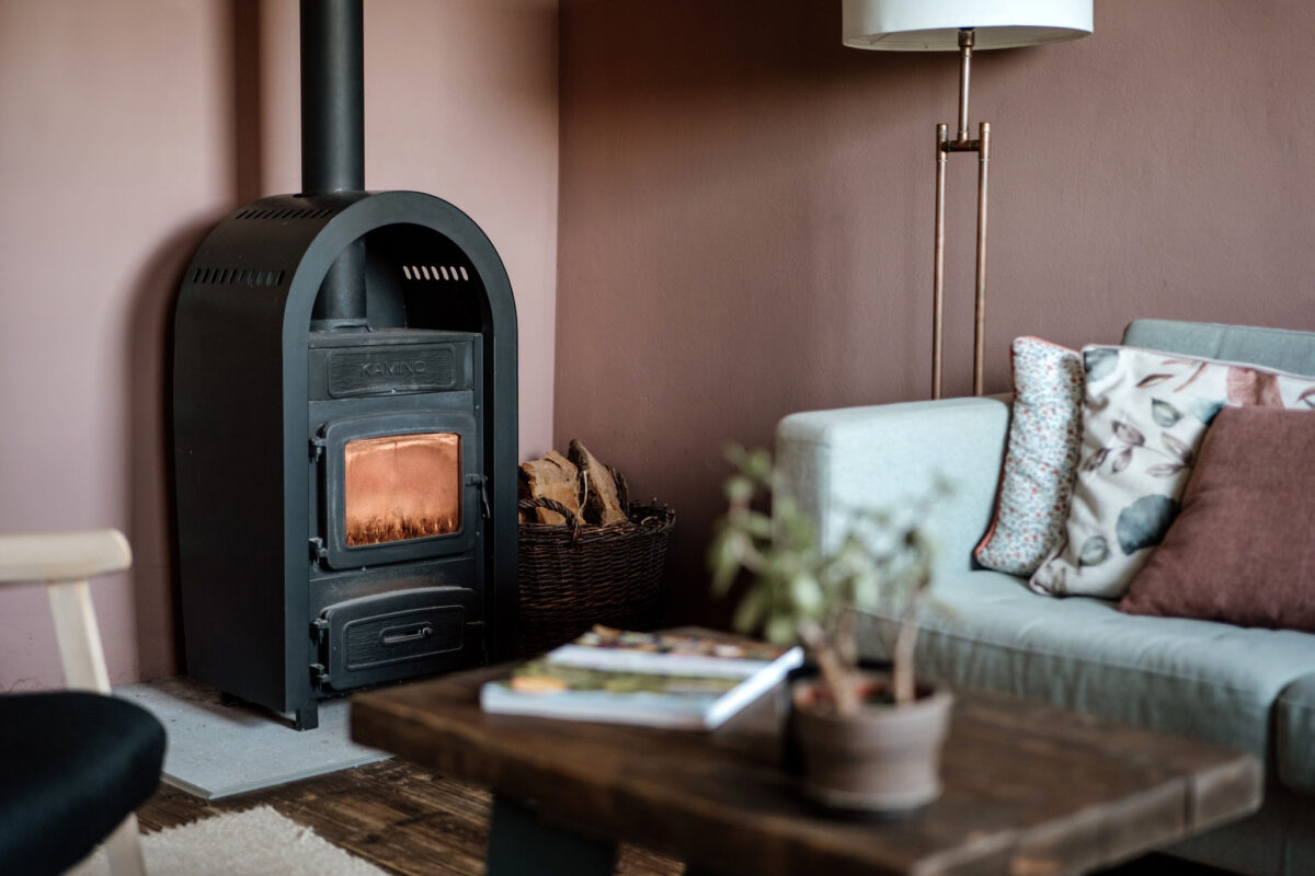 Fehér, hengeres cserépkályhák vagy a kis vaskályhák mutatnak jól, természetes fa kiegészítőkkel. A tűz melege itt a „hygge” fontos része.