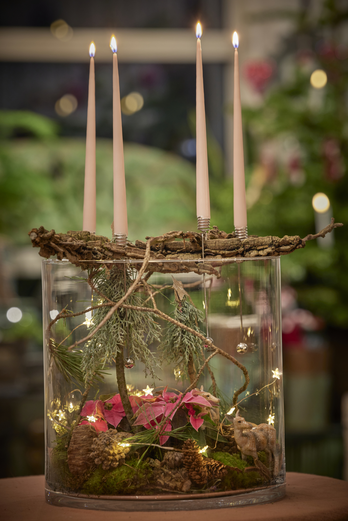 Így készíthetjük el: egy darab csirkedrótból alakítsunk ki egy kúp alakú keretet, és erős orsóhuzallal rögzítsük a törzshöz. Ezután kössük a fenyőágakat a drótkerethez további orsóhuzallal, majd készítsünk mikulásvirág kokedámákat, és zsinórral akasszuk fel őket a fára. Végül a fa tetejére rögzítsünk egy vágott mikulásvirágot egy vízzel töltött kémcsőbe.