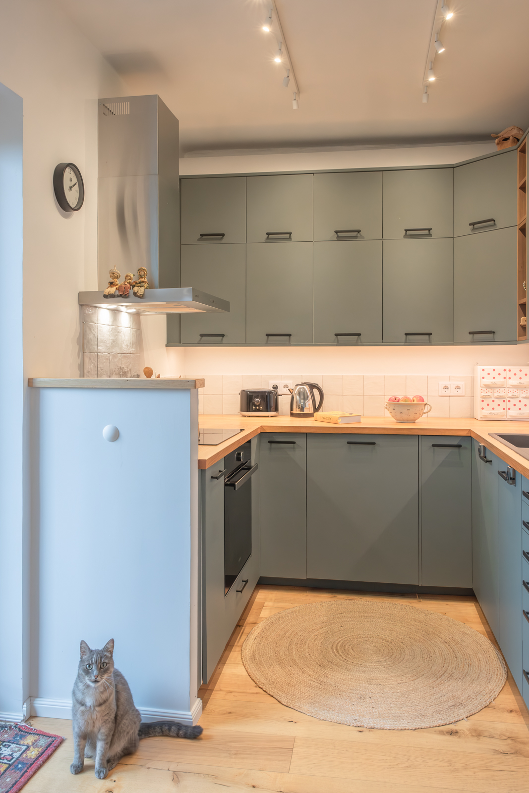 A konyhaszekrény penészzöld színe szépen harmonizál a nappali zöldjeivel, bár eredetileg feketét szeretett volna Réka, de nem elég világos ehhez a konyha, ahova csak az áthelyezett erkélyajtó felől érkezik természetes fény. Egy ablak helyére került a dupla erkélyajtó, amikor a nappali felőli keskeny ajtót lezárták. A 4-5 négyzetméteres egyszemélyes konyhában minden kézre esik, az U-alak miatt csak forogni kell. A kialakításánál Réka betartotta a kurzusban tanult technológiai sorrendet. Fontos volt számára, hogy bármilyen kicsi is, mindenképpen legyen egy pici felület a hűtő meg a mosogató között, ahová lepakolhat. Ahogy az is, hogy itt is legyen egy pengefal a tűzhely mellett, ami optikailag elhatárol, de beengedi a fényt, és van egy kis tárolófelület a tetején.