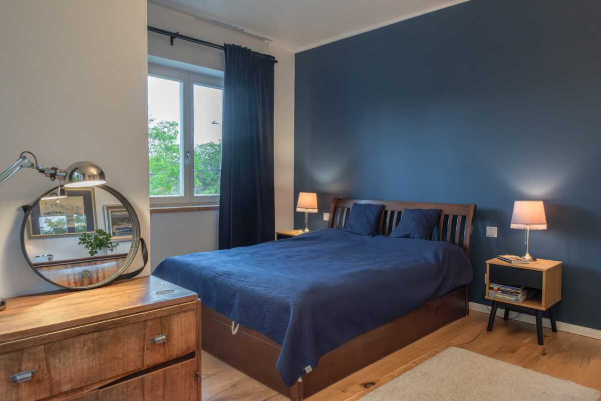 A régi hálóban hasonló sötétkék volt a fal. Akkor még bizonytalan volt Réka, de kipróbálta, mert nem tűnt olyan nagy kockázatnak, legfeljebb átfestették volna, ha nem tetszik nekik a végeredmény. Azonban mindketten beleszerettek, és ebben hálóban már több felületen megjelenik a kék.