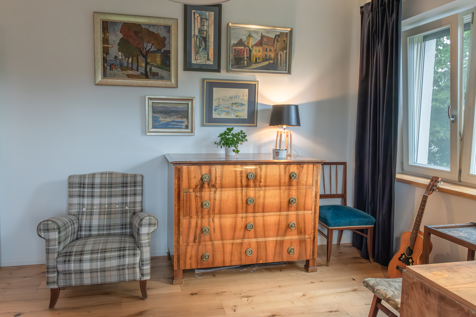 A régi bútorokat Réka családjától örökölték, nem különösebben értékesek, de érzelmileg kötődnek hozzájuk. Kivétel a hálószobai komód, amit a barátaiktól vettek, és a tíz éve vásárolt kerevet a nappaliban, ami elképesztően rossz állapotban volt mielőtt egy restaurátorral rendbe hozatták. A képek többsége a férj családjától származik, csak a hatalmas balatoni kép nem, ami az előszobában lóg a falon. Egy jegyzett festő alkotása, de nem ezért szereti Réka annyira, hanem, mert megnyugtatja a látványa.