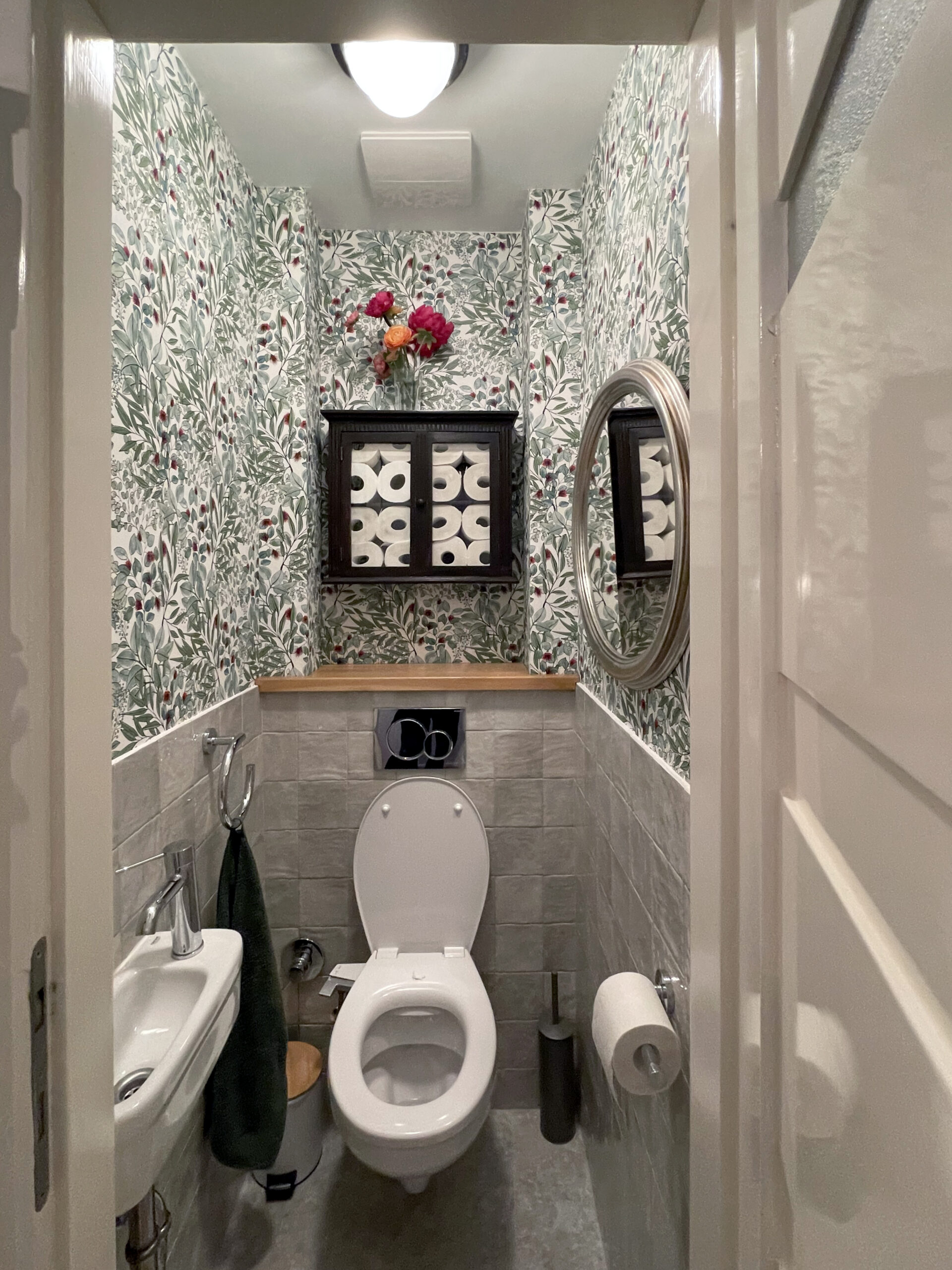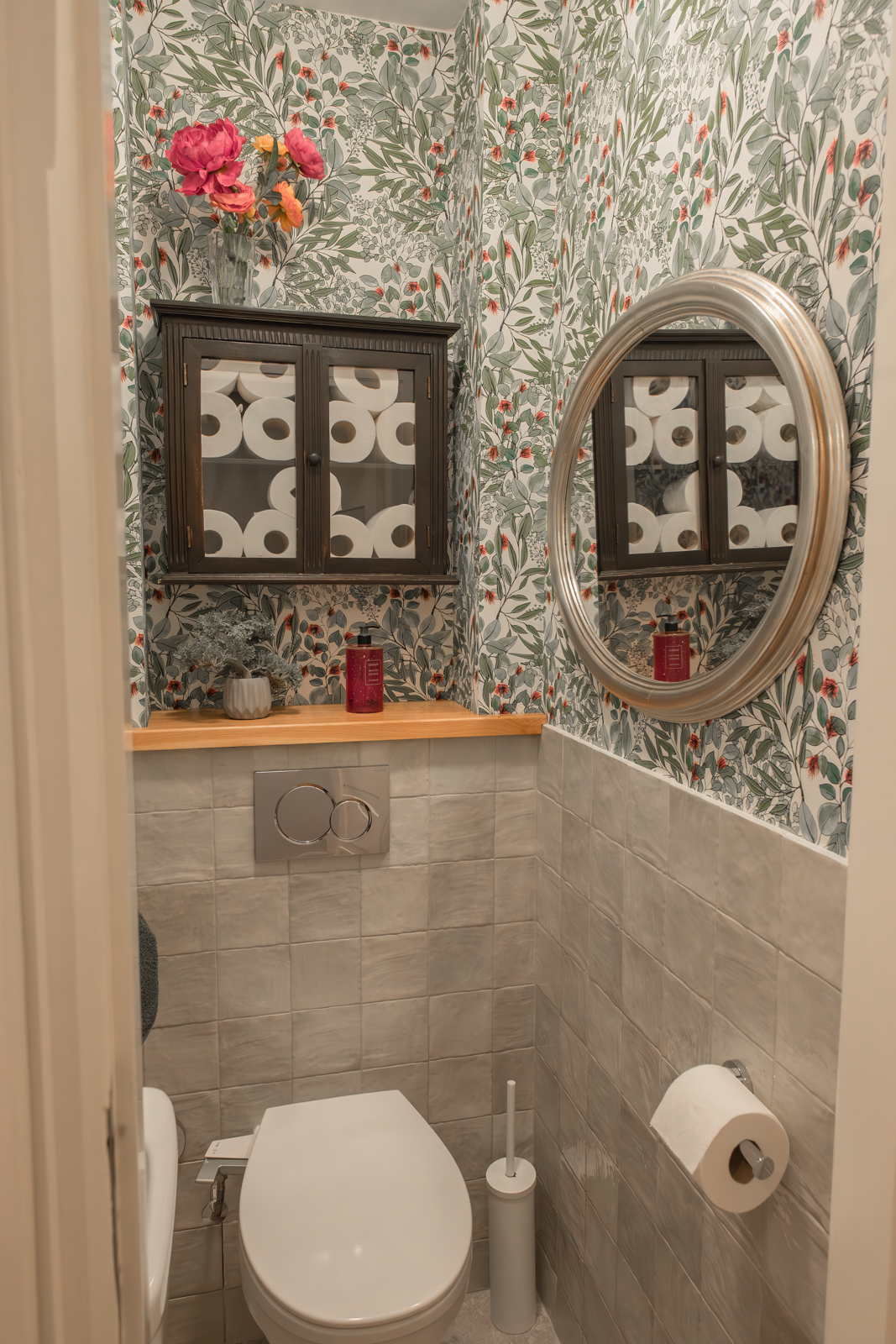 „A tapétán sokáig gondolkodtam, hogy feltegyük-e, mert sokkal élénkebb, mint a csempe, még az Otthonkommandó Facebook csoportjában is megkérdeztem a többieket róla. Megoszlottak a vélemények, de nagyon sokan mondták, hogy szerintük jó, így végül fölraktuk. Ránézve néha még most is elbizonytalanodom.”