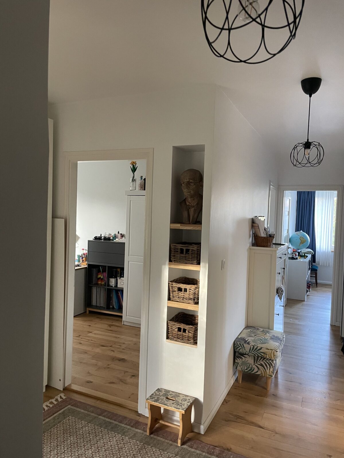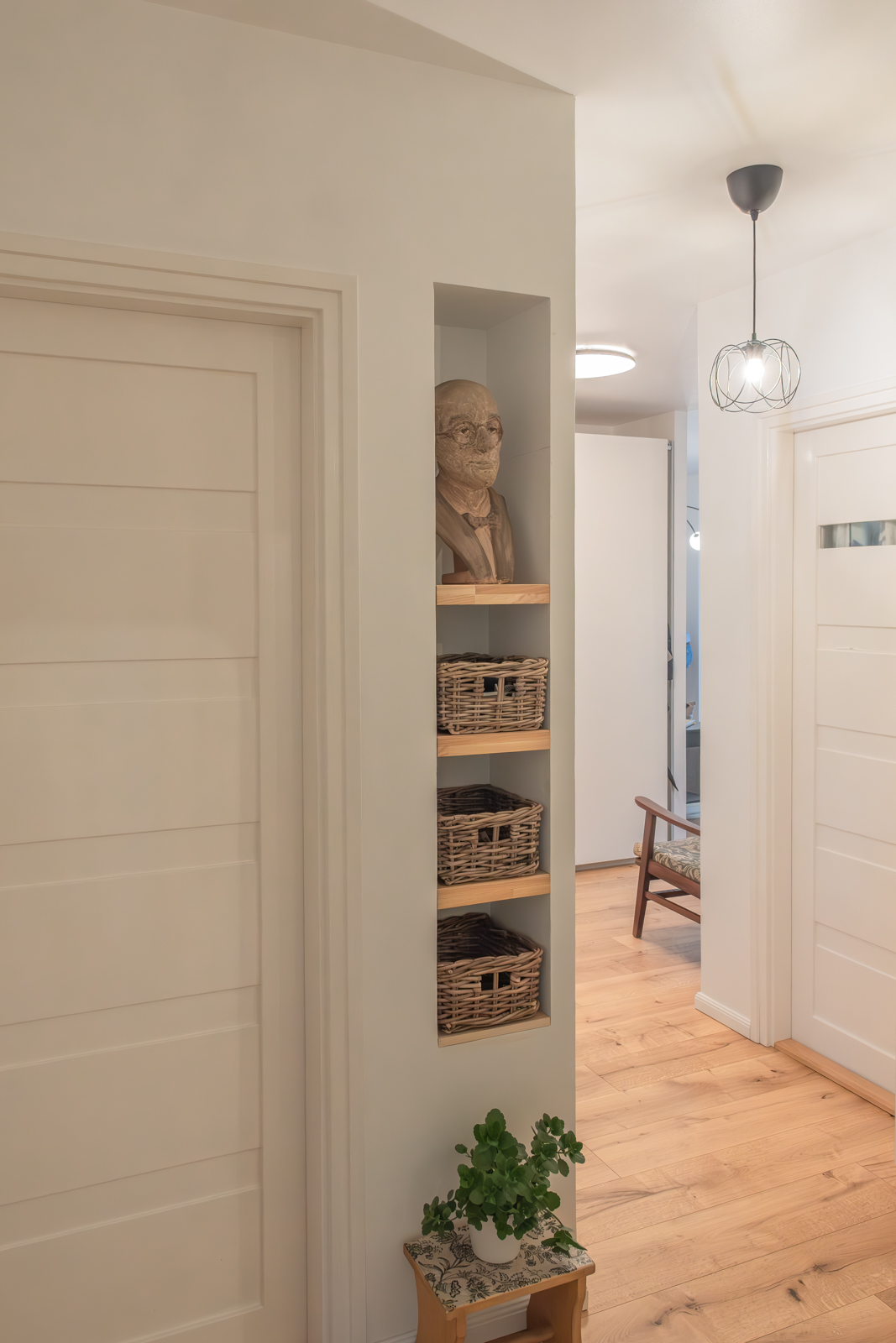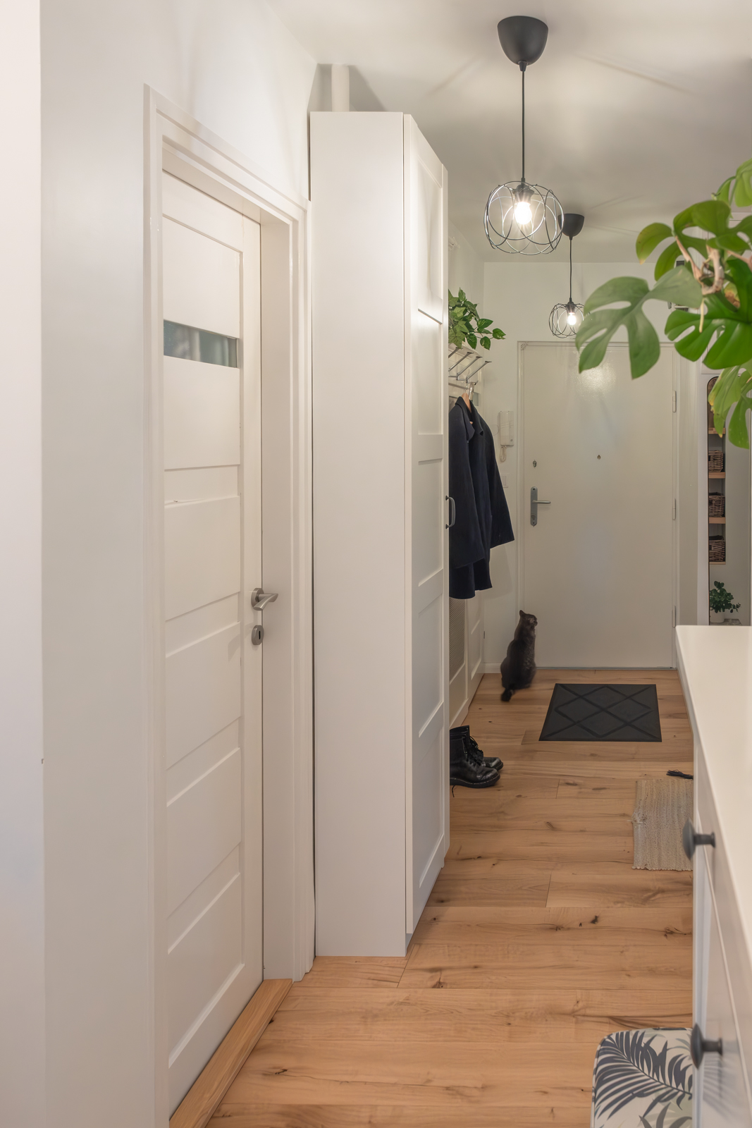 Az, előszoba egy keskeny folyosó volt. Réka ötlete volt, hogy nyissák ki, mert amikor mind az öten hazaérkeznek, meg készülődnek, nem fértek volna el az eredeti másfél méteren. Egész más érzés egy tágas előtérbe belépni, akkor is, ha ennek az volt az ára, hogy kisebbek lettek a lányok szobái, mert eredetileg a két szoba egészen az előszobáig ért.