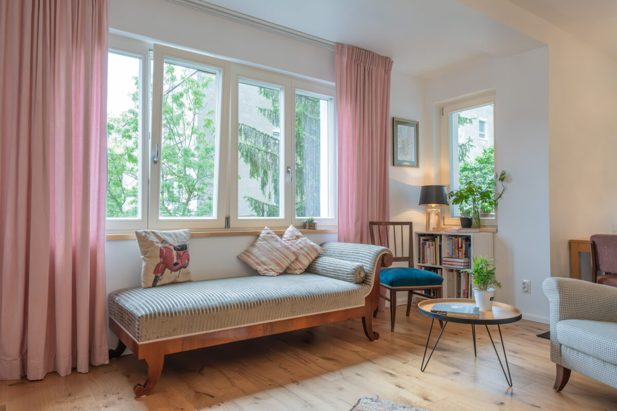 Az előző lakás berendezése organikusan alakult az évek során. A színeken változtatott csak Réka tudatosan; falak, díszpárnák, és a nappaliban látható rózsaszín függöny, amit eredetileg még oda vettek.
