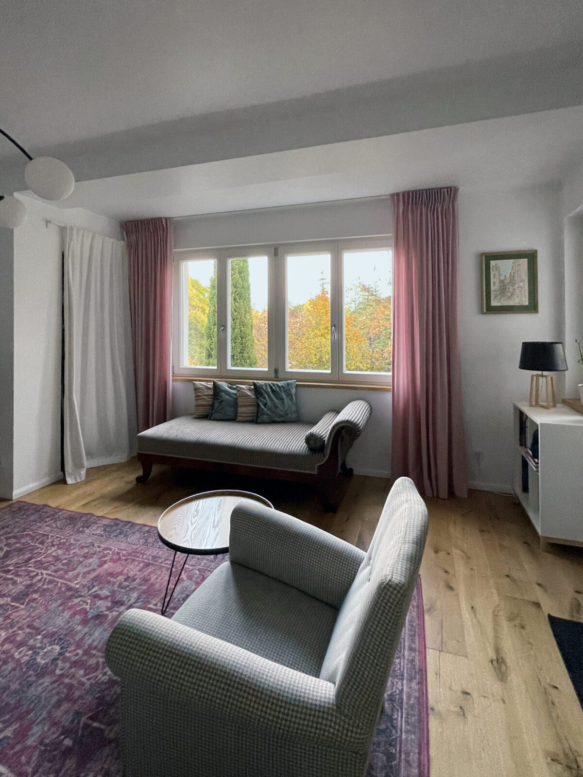 A nappaliban a korábbi fotón látható pici szőnyeg csak átmeneti megoldás volt, a korábbi, klasszikus bordó perzsájukat nem tartották jónak ide. Sokáig válogattak, hogy milyen legyen helyette, mire megtalálták ezt a lilás-pirosas koptatott műperzsát. Így a zöldes-rózsaszínes színállással már nem annyira neutrális az összkép.