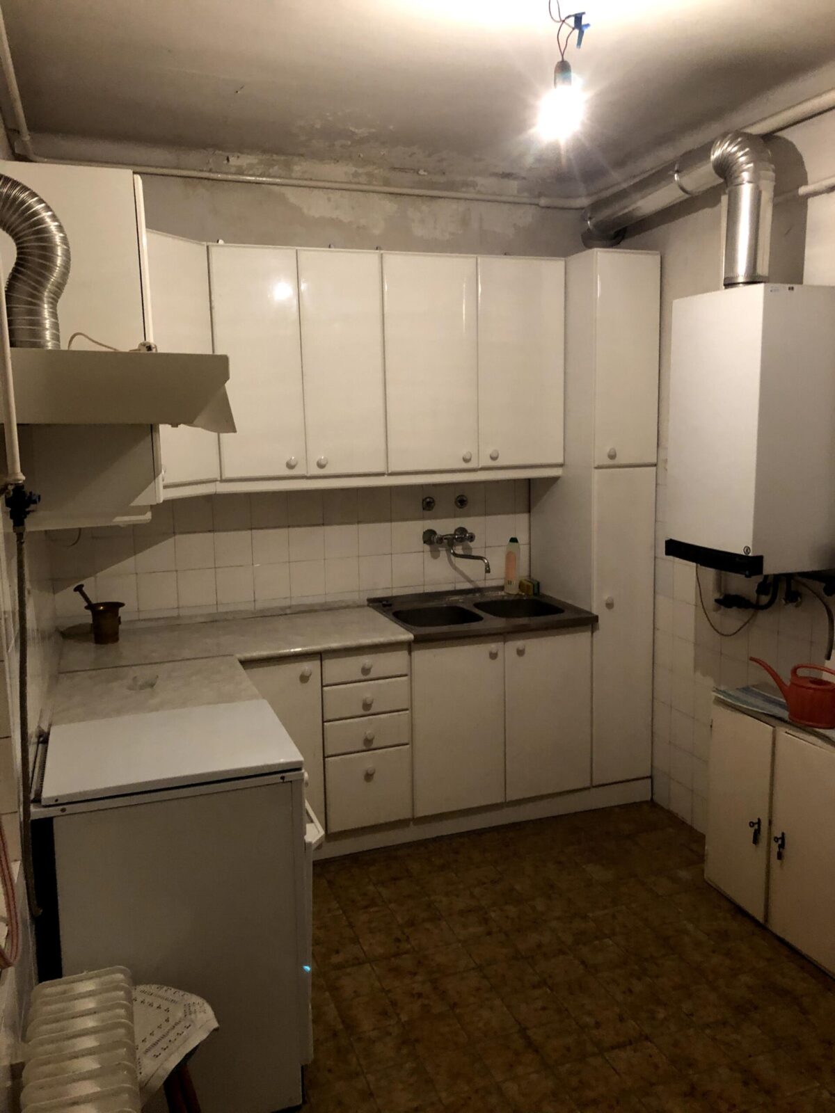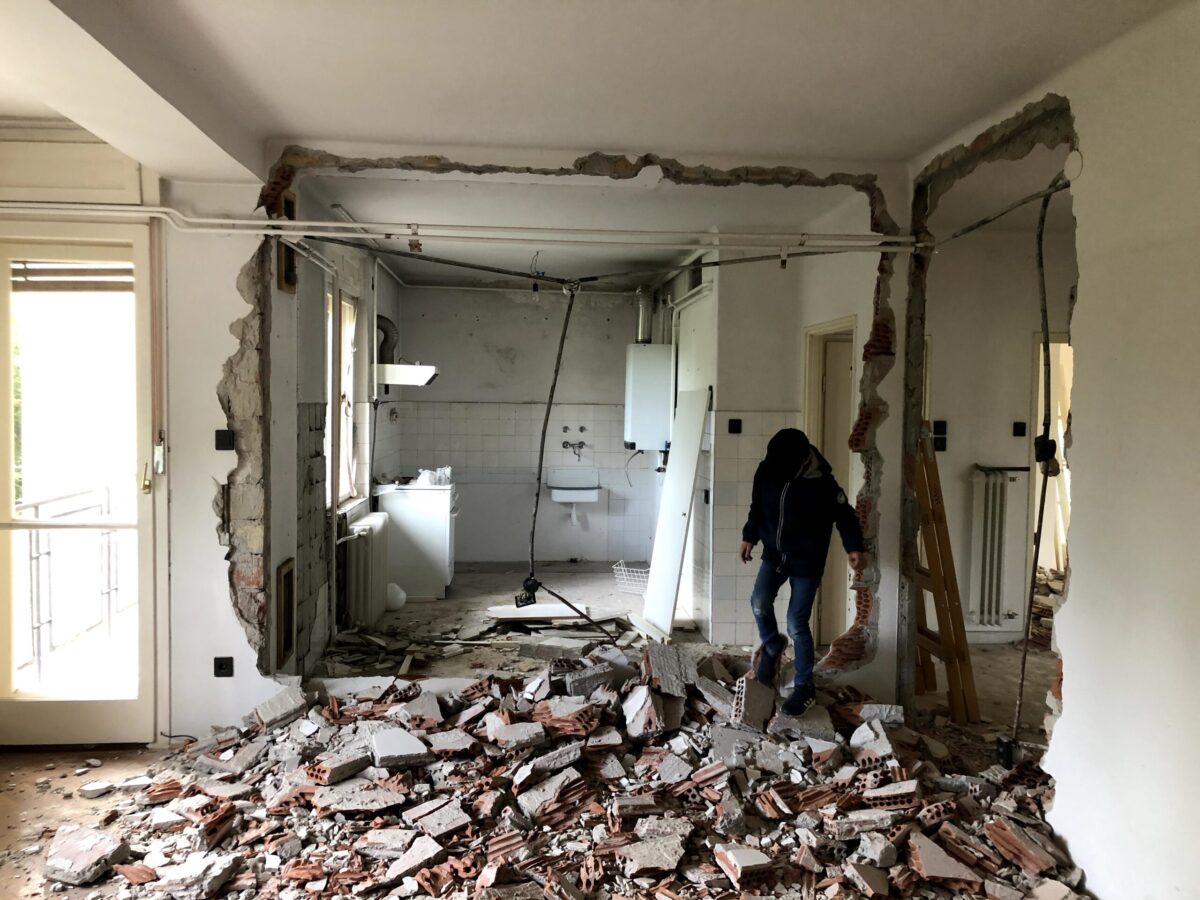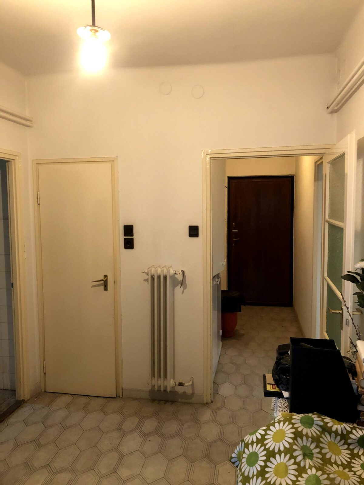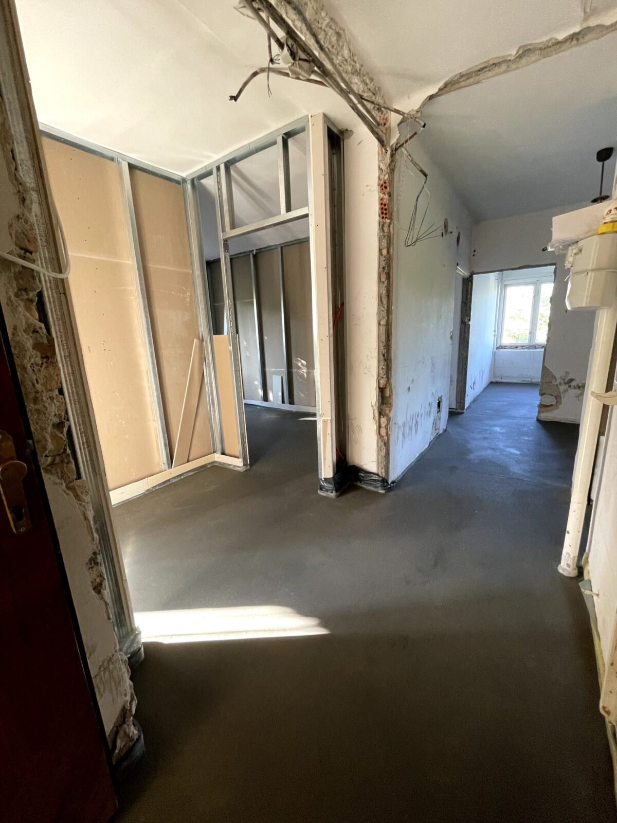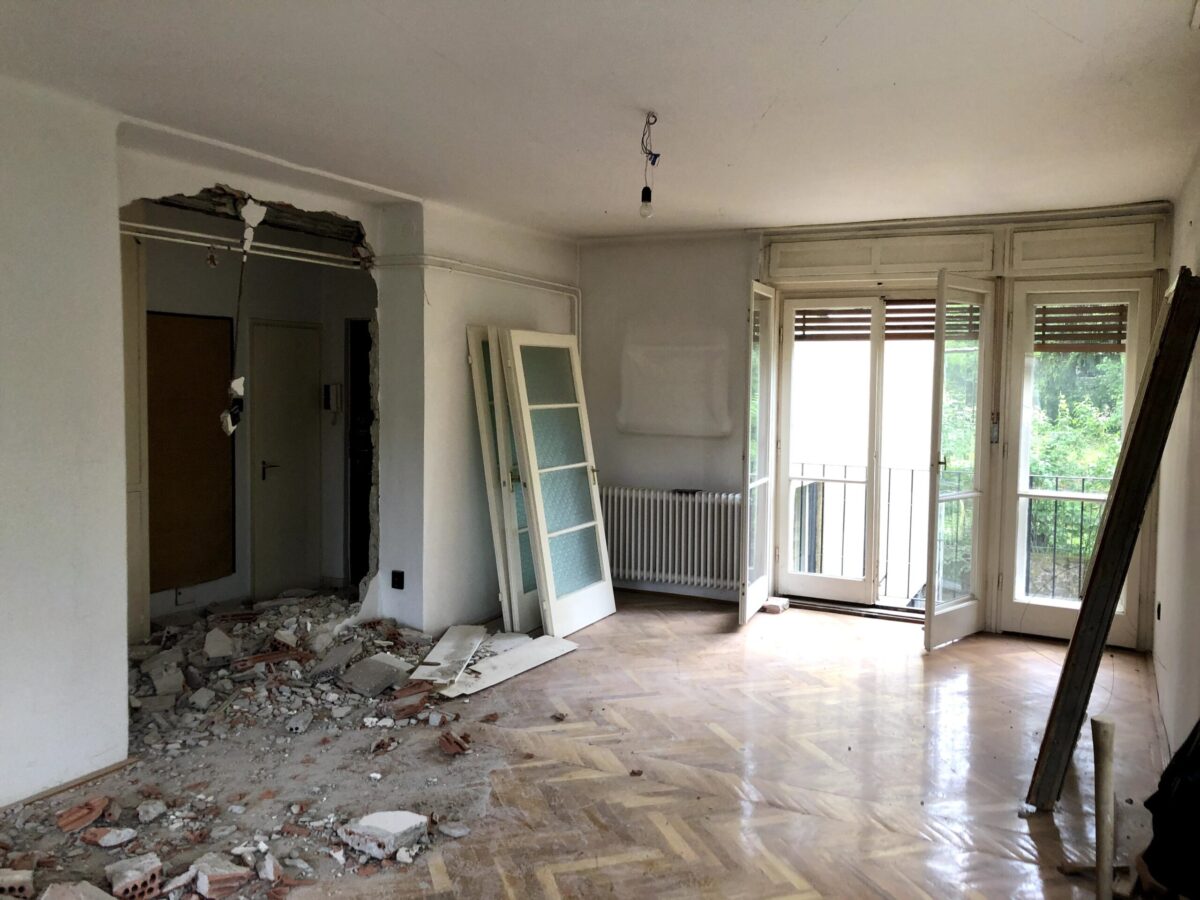 A ’60-as évek második felében épült kockaházban lévő lakás teljes műszaki felújítást igényelt. A felújítás azzal kezdődött, hogy teljesen kibelezték a lakást, gyakorlatilag csak a befoglaló falak maradtak.