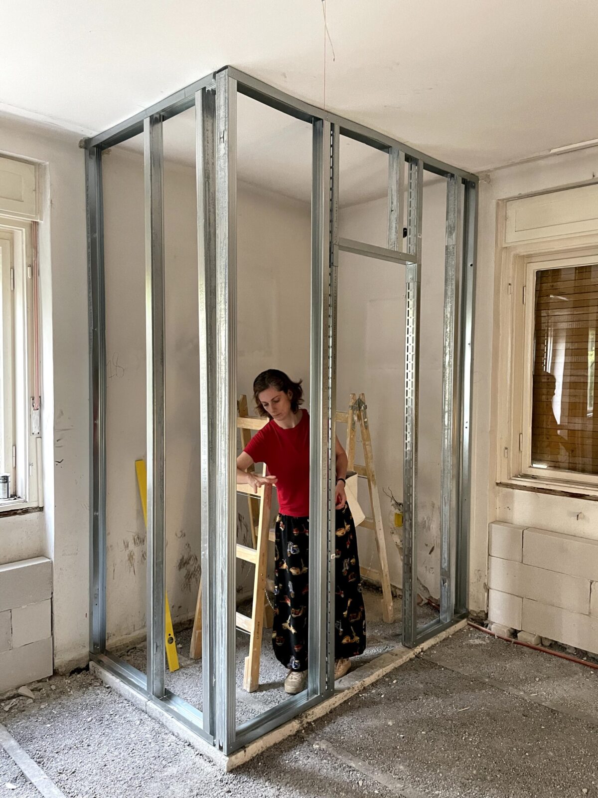 Az eredeti alaprajzon is ott volt a négy szoba, ahol most, de az előző lakó összenyitott hármat, amit Rékáék visszaalakítottak. A konyha maradt az eredeti helyén, de kivették az ajtaját és egybenyitották az étkezővel meg a nappalival. A fürdőszoba is ott volt, csak kisebb volt. A nagy gardróbszekrény oldalánál pedig meghosszabbították a falat, hogy ne látszódjon a nappaliból a szekrény oldala. Ehhez is nagyon korán tudni kellett, hogy pontosan mekkora bútor fog idekerülni.
